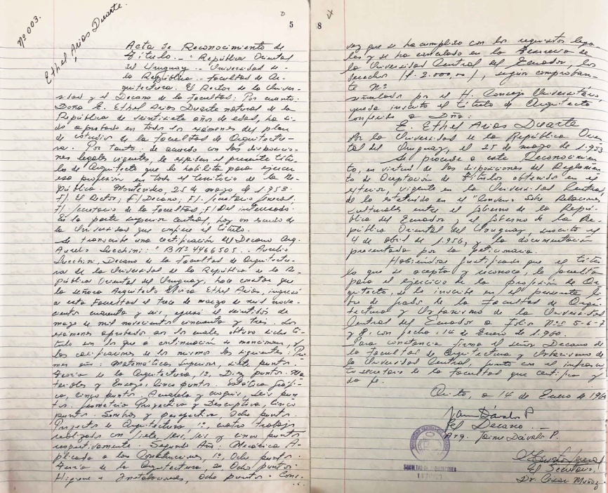 Figura 2: Acta de reconocimiento de título de Ethel Arias. Actas de Grado Facultad de Arquitectura y Urbanismo, Universidad Central del Ecuador, Libro Uno, Folio 5, Acta No. 3. Pp. 5 y 8.