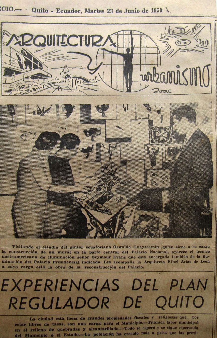 Figura 5: “Visitando el estudio del pintor ecuatoriano Oswaldo Guayasamín quien tiene a su cargo la construcción de un mural en la parte central del Palacio Nacional (...). Les acompaña la Arquitecta Ethel Arias de León a cuyo cargo está la obra de la reconstrucción del Palacio.” S.A. (23 de junio de 1959). Arquitectura y Urbanismo. El Comercio.
