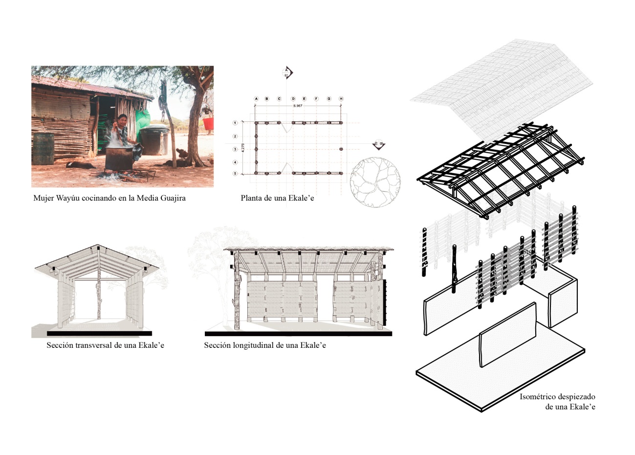 La materialidad del Ekale’e corresponde al contexto donde se emplaza. De este modo, los que se construyen en la baja y media Guajira pueden ser en madera, bahareque o sistemas mixtos, con una cubierta de Yotojoro, Palma o tejas de zinc; este último limita el confort térmico, pero disminuye la posibilidad de incendios en este espacio (Ver figura 34), sus cerramientos no suelen construirse totalmente en bahareque debido a la necesidad de ventilación continua en este espacio. En la alta Guajira, su materialidad más recurrente es un tejido en yotojoro, en toda la composición.