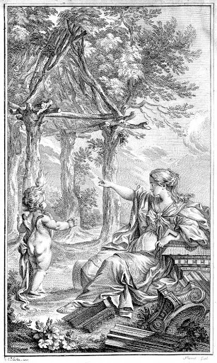 Figura 2: Grabado de La Cabaña Primitiva por Charles Dominique Eisen, en M. Laugier, Essai sur l´architecture.