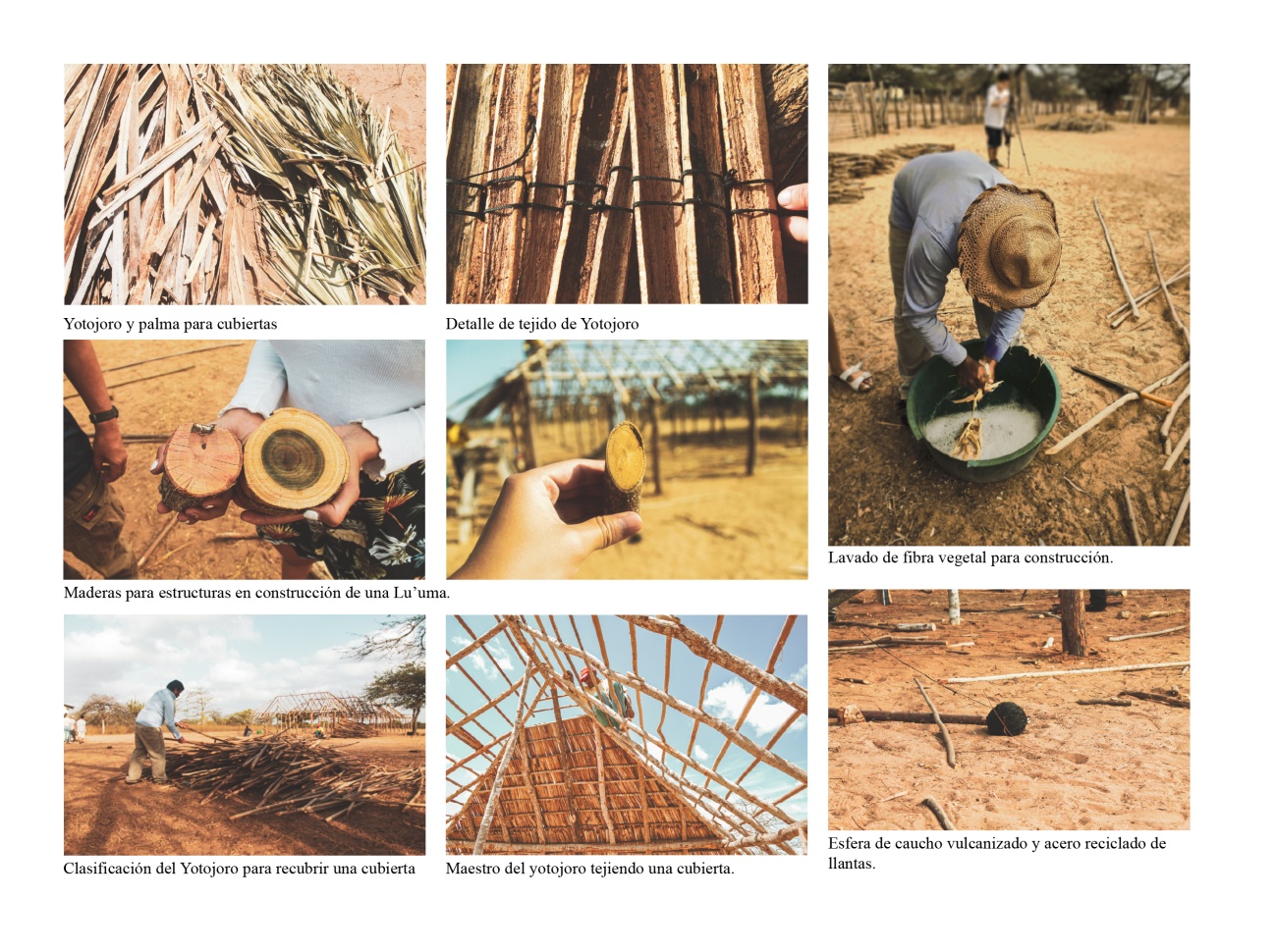 Figura 4. Fotografías materiales para construcción y actividades para la construcción, detalles de tejido en Yotojoro. Elaboración de tejido a partir de fibras naturales (corteza del árbol de trupillo). Fotografías tomadas durante una yanama, la fiesta que reúne a la comunidad para trabajos de construcción.