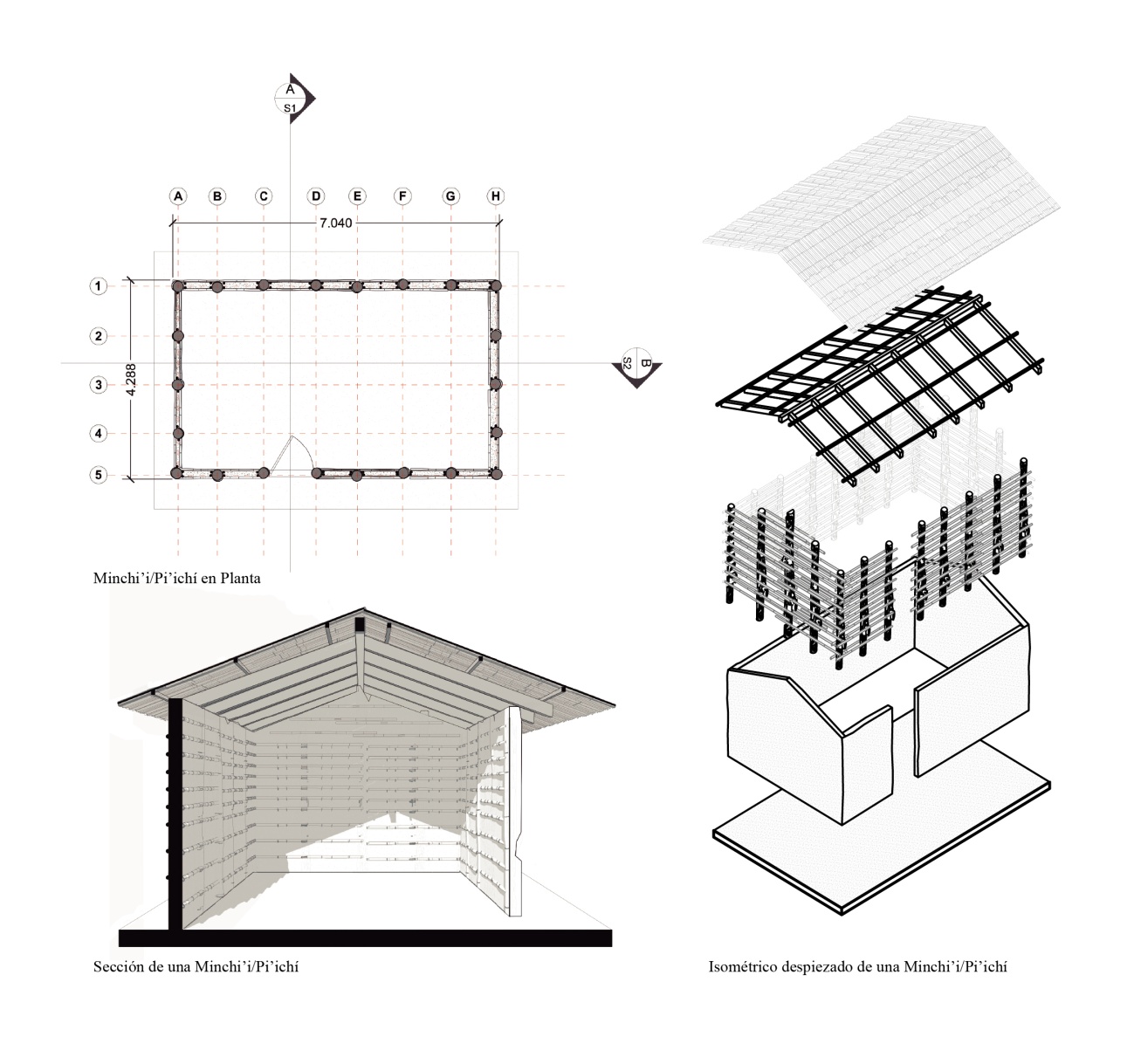 Su nombre varía debido a su localización geográfica; en la baja y media Guajira o Woppumüinjee es nombrada Minchi’í, mientras que, en el alta y el extremo norte, Pi’ichí. Las variaciones en su nombre, usos y materiales e incluso dimensiones, también están asociadas a las regiones de su territorio y sus particularidades; los cerramientos pueden estar constituidos por un tejido de bahareque sin revoque, con una cubierta en palma o por un tejido elaborado a partir del Yotojoro, material que se obtiene del corazón de los cardones guajiros secos (Stenocereus griseus), abundantes en su territorio y con una estructura en madera rolliza, aunque en algunos casos usan madera aserrada. Las dimensiones de la Minchi’í/Pi’ichí obedecen a un formato rectangular con cubiertas a dos o a cuatro aguas con pendientes variables, en algunas ocasiones con saledizos que resuelven sombra y cuentan siempre con un mueble estratégico que consideramos modulador del espacio: el chinchorroiii; es decir que la sección transversal de la Minchi’i/Pi’ichí corresponde al ancho requerido para que la catenaria formada por la elongación del chinchorro sea la ideal.