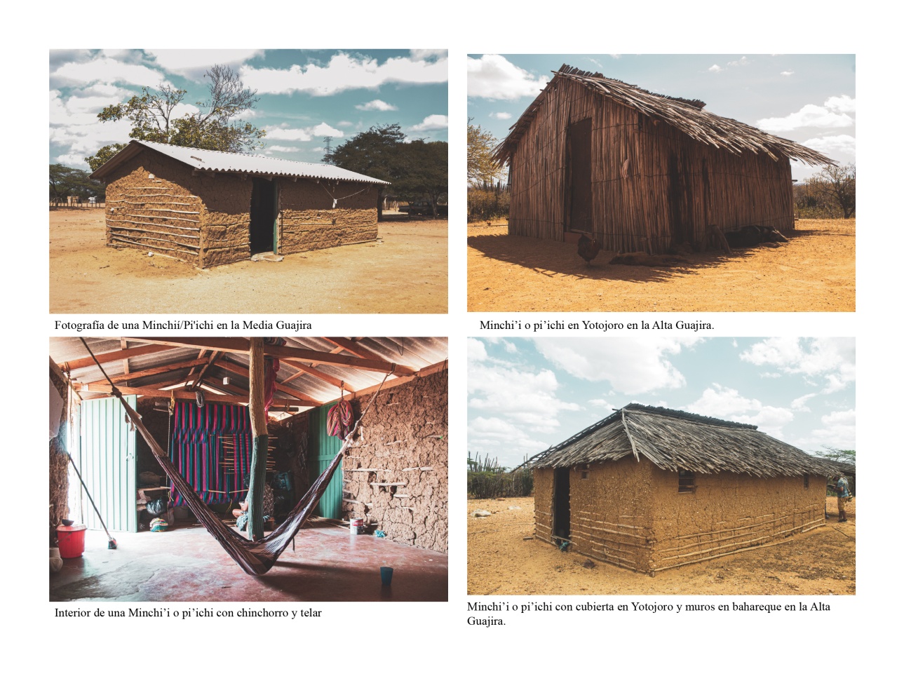 Figura 3. Fotografías de Minchiís/Pi’ichis en la Media y Alta Guajira y Fotografía interior Minchií/Pi’ichi en Montañitas.