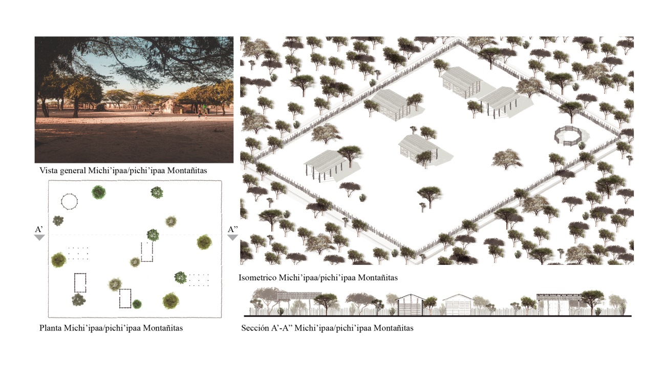 Así mismo, surgieron otros interrogantes al considerar el estudio de los elementos materiales que componen sus espacialidades, sus relaciones con el entorno y sus significados, plantearon la necesidad de relacionar arquitectura y etnografía, donde «aprender a ver» el mundo habitado y construido por el Wayúu, implicó un paciente ejercicio de observación y diálogo, de inferencias y conclusiones, dibujando a partir de la propia experiencia adquirida en campo, una versión de estas expresiones arquitectónicas y de algunos de sus significados, creando unas condiciones de partida para producir y componer arquitectura a partir de estos elementos en futuros ejercicios. Adicionalmente, el territorio ancestral Wayúu tiene su propia lengua, el Wayuunaiki, no obstante, algunos conceptos en castellano no tienen su equivalente; la misma palabra «arquitectura», por citar uno, no existe. Eso implicó recurrir a estrategias de diálogo particulares para construir conocimiento de manera conjunta, aprendiendo de la utilidad que los Wayúus encuentran en describir su mundo en español por medio de la metonimia, por lo que resultó eficaz para aproximarnos a algunas toponimias y formas descriptivas, en general a numerosos términos en wayuunaiki, y permitió asomarnos a la memoria que yace en esas arquitecturas.