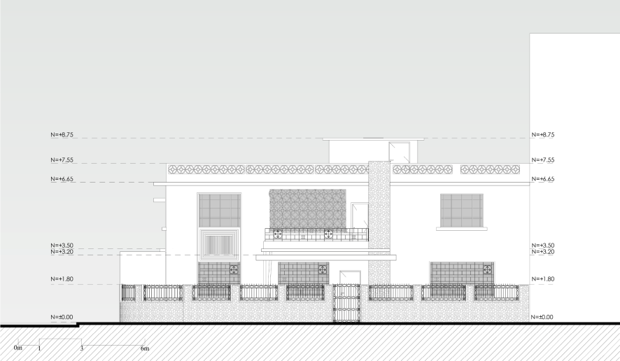 En cuanto al entorno, se puede deducir la decisión del arquitecto de vincular el proyecto con su contexto inmediato, que incluye la vía y los colindantes (pequeña escala), en esta obra Rodríguez adopta por primera vez los retiros frontales y laterales en un proyecto en la ciudad; siendo este, el primer proyecto residencial diseñado y construido con estas nuevas normativas, lo que conllevó a que el arquitecto diseñara unos patios propios de la vivienda, y que los ubica como una forma de transición entre lo público y lo privado. Es tan importante para Rodríguez vincular este proyecto con su entorno, que decide ubicar un cerramiento de muro pero con elementos metálicos, que permite que exista el vínculo entre el proyecto y el peatón mediante la permeabilidad visual (Figura 23).