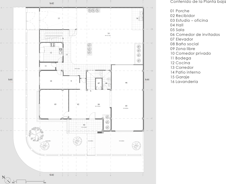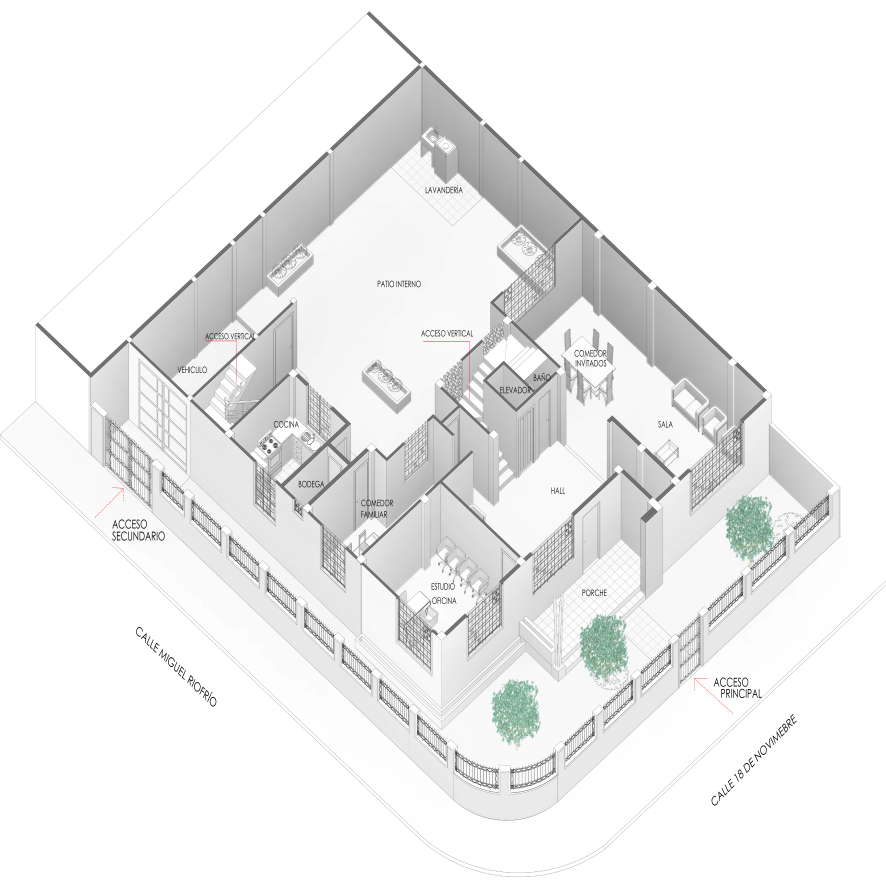 En esta planta baja se destina como innovación, una zona para el vehículo; además, de generar un gran patio privado que ya no es como un espacio en el que se desarrollan las otras actividades, como se lo venía desarrollando en los proyectos de la época colonial y republicana, sino que resulta como un espacio privado para el esparcimiento del individuo.