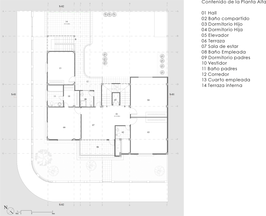 En la planta alta 1 se mantiene la coherencia y orden en la circulación, por un lado se destina el acceso secundario para la circulación del personal de aseo y también un recorrido directo desde la zona del vehículo en la planta baja hasta la zona privada del proyecto, sin tener que acceder por la zona social (Figura 16).