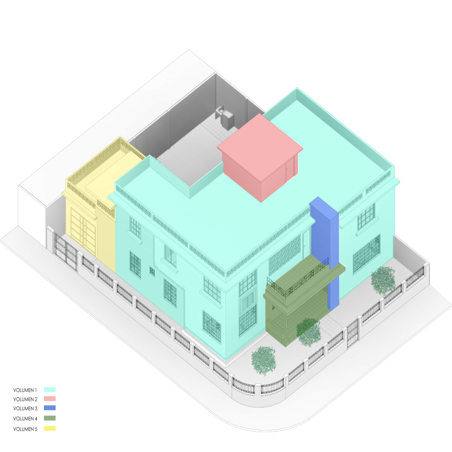 En lo que respecta al estudio formal, se puede concluir que el proyecto tiene 5 volúmenes claramente identificados; el primero es el volumen que contiene gran parte del programa, por otro lado el volumen vertical que sustrae el volumen principal; y que es destinado a la caja de gradas y elevador. El tercer volumen, es el que contiene el porche del proyecto, realizando una adición al volumen principal. El cuarto volumen, es el plano vertical que contiene el baño compartido y que también tiene una composición de adición; es el elemento de mayor jerarquización del proyecto y está ubicado en el ingreso de la construcción. El quinto volumen, es la caja de gradas secundarias que tiene una diferente altura de todo el proyecto y que se adiciona al volumen principal (Figura 19).