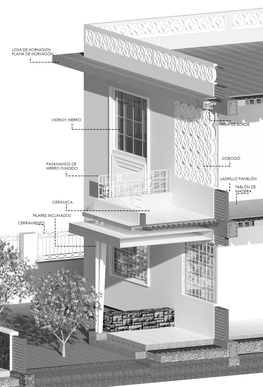 Este proyecto es una de las primeras obras que Rodríguez construye con hormigón armado, como un sistema de construcción nuevo e innovador en la ciudad; además utiliza la piedra pizarra traída desde Cariamanga para ubicarla en el cerramiento y en la fachada sur del proyecto (Figura 17); este es un recurso que el arquitecto comienza a implementar en casi todas sus obras en la ciudad a partir de 1960. También dispone de ventanas de vidrio y marcos de hierro; en los pisos ubica un tipo de baldosa rectangular y mantiene la mampostería de ladrillo panelón con revestimiento y enlucido externo e interno. Otro recurso que utiliza el arquitecto es la utilización de marcos de hierro en el cerramiento creando así una permeabilidad visual desde lo público hasta el proyecto (Figura 18).