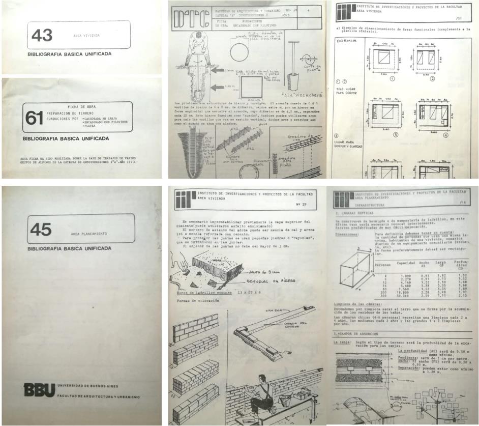 A pesar de su breve duración, el IIP generó una gran cantidad de ponencias, cartillas y documentos. En varias bibliotecas de las facultades de arquitectura del país y archivos personales de arquitectos se puede encontrar la “Bibliografía Básica Unificada” (Figura 6 y 7), que fueron una especie de cartillas temáticas que se abocaron a diferentes áreas de la formación, tales como vivienda, planeamiento, construcciones, etc. Algunas de ellas fueron el resultado de trabajos en las cátedras con los estudiantes, otras de proyectos de investigación y sistematización, y otras condensaron información que Tempone, Estrella y otros profesionales habían desarrollado en sus diversas experiencias.