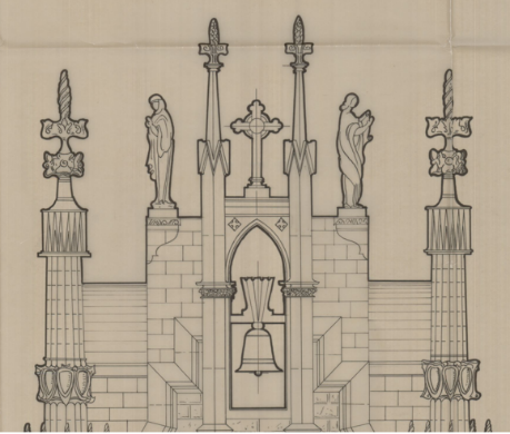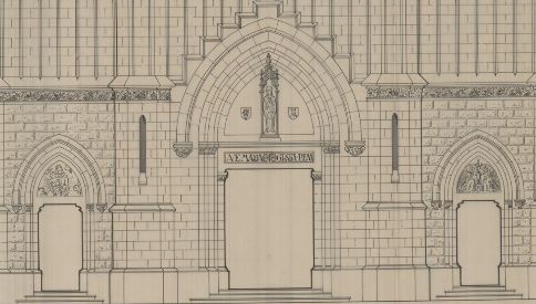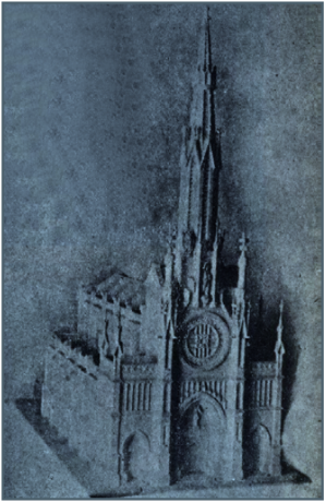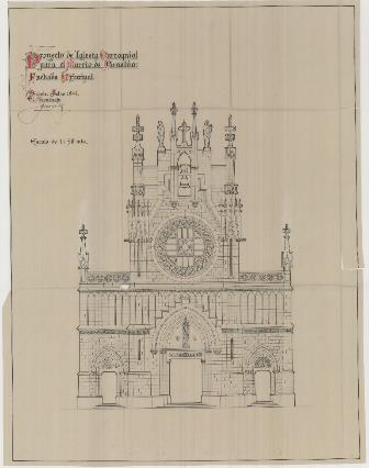 Al comparar el contenido del aparato gráfico que lo acompaña9 (Figs. 1, 2, 3, 4) con el estado actual de la iglesia (Fig. 5), puede corroborarse que la obra no llegó nunca a completarse. Las enormes diferencias entre el proyecto planeado por Vidal Ramos y su consecución final, y que afectan sobre todo al exterior, se hacen más patentes al analizar la maqueta del mismo, conocida por fotografías antiguas y encontrada en 2008 dentro de la propia iglesia (Pérez del Hoyo, 2012: 387, 388, figs. 6 y 7) (Sala, 1983: 57)10 (Fig. 6). Sin embargo, hay algo que resulta chocante en ella y es que no coincide con el alzado de la fachada realizado por el arquitecto en su proyecto de 1945 (Fig. 1); el dibujo es similar a la maqueta en el cuerpo inferior y hasta el rosetón, pero carece de la esbelta torre que presenta aquélla y, a pesar de que mantiene los pináculos laterales de forma idéntica, al eliminar la torre, remata el conjunto con una solución plana, decorada con una cruz central entre pináculos y dos esculturas de bulto redondo en los extremos (Fig. 7). Lo que induce a pensar que la maqueta podría representar el proyecto no realizado de 1924 y no el de 1945.