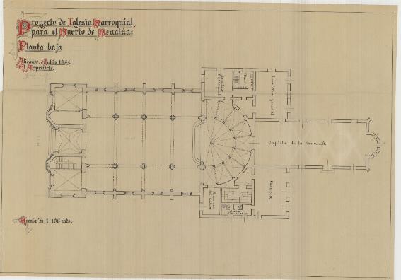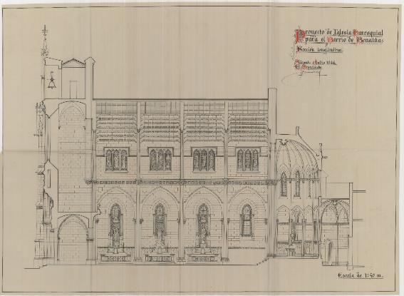 Se sabe que la iglesia de San Juan Bautista del barrio alicantino de Benalúa contó con un primer proyecto de construcción elaborado por Vidal Ramos en los años 20, pero lo cierto es que la única información precisa, hoy en día, nos la proporciona el de su reconstrucción tras la Guerra Civil, bajo los auspicios de la Junta Nacional de Reconstrucción de Templos Parroquiales4 en 19455. Aunque dicha primera iglesia se ha datado en 1923 (Sala, 1983: 47) (Alonso, 1986: 34), el propio arquitecto, en la Memoria que acompaña al susodicho proyecto del 45, lo fecha en 1924, aludiendo a una iglesia anterior6 que fue demolida por falta de conservación e informando del inicio de la construcción de otra nueva, cuya parte edificada fue devastada en la Guerra Civil (AGA, (04) 81.1, TOP 76/04-12, Caja 3501. Memoria: 1, 2).