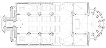 Por lo que respecta a los materiales y estructuras, sólo se utilizó la sillería, de piedra arenisca, en la fachada principal, aplicándose en el resto mampostería del mismo material y enlucidos maestrados de cemento o yeso. Para dar estabilidad a la construcción, se empleó la mampostería hormigonada en muros y, en los pies derechos, el hormigón armado, pero se hizo uso de elementos fingidos, como los arcos ojivales de ladrillo hueco, y pseudoestructuras sin función tectónica en las bóvedas, construidas de escayola y levantadas en el deambulatorio, en el ábside de cuarto de esfera con nervios decorativos y en las naves laterales (AGA… Caja 3501. Proyecto de febrero de 1945: 1-3), con bóvedas de arista, no de crucería como correspondería al estilo. Asimismo, la cubierta se resuelve de modo simple y económico, sin el recurso a la bóveda, a base de un artesonado a dos aguas sobre arcos diafragma apuntados (Figs. 2, 3 y 12).