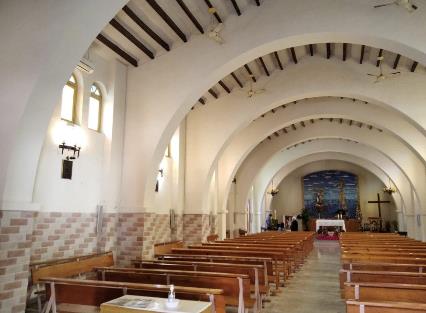 Otro proyecto del autor que presenta similitud es la iglesia de San Pascual Baylón, de los Padres Capuchinos de Alicante, construida en el mismo año de 1945 (Domingo, 2012: 162); en este templo, también se sirve del artesonado sobre arcos diafragma ojivales (Fig. 19), como ya se ha visto, modo de abaratar la construcción en los tiempos de escasez de la posguerra. Pero véase aquí la distinta solución absidial, más en la línea del templo-modelo de la Exposición de Vitoria de 1939 (Fig. 13). Por último, de la misma forma, en la ermita de pescadores de Nuestra Señora del Carmen de Campello, erigida en 1948 (Alonso, 1986: 40), aunque de un modo más modesto, incorpora de la misma forma el artesonado sobre arcos diafragma (Fig. 20), pero, en este caso, con una estructura más precaria y con arcos de medio punto, creando un escenario de menor impacto espacial.