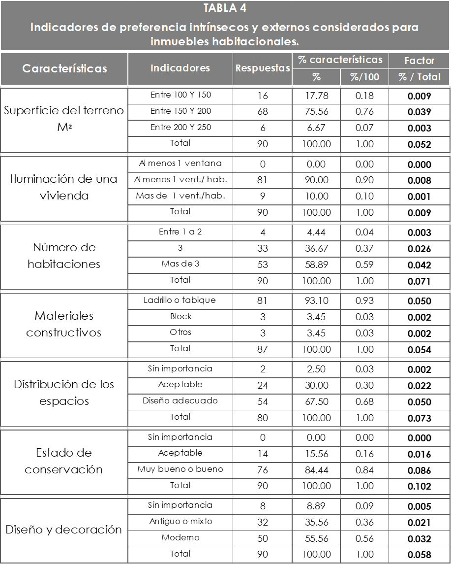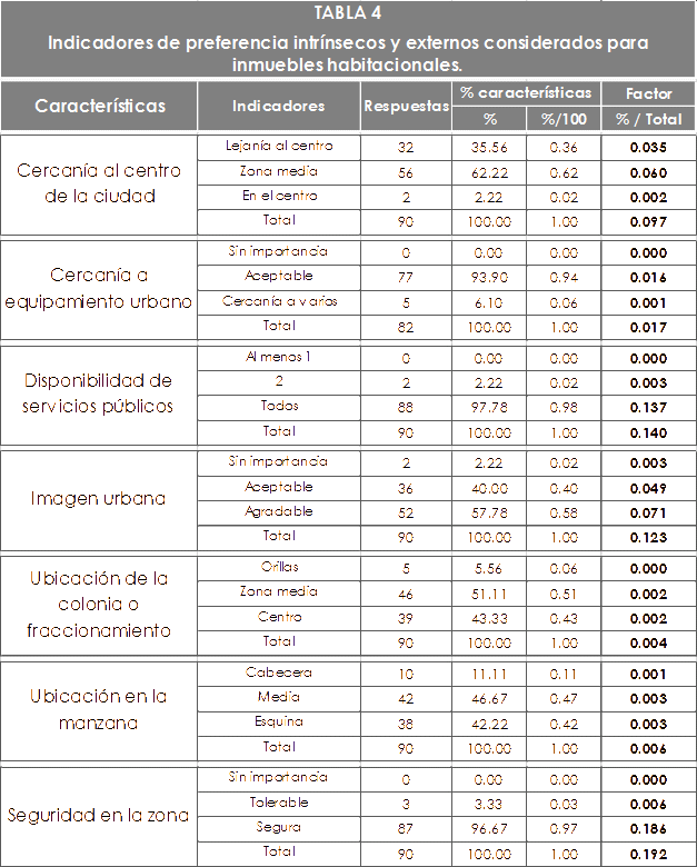 tabla 4. Indicadores de preferencia para inmuebles habitacionales.