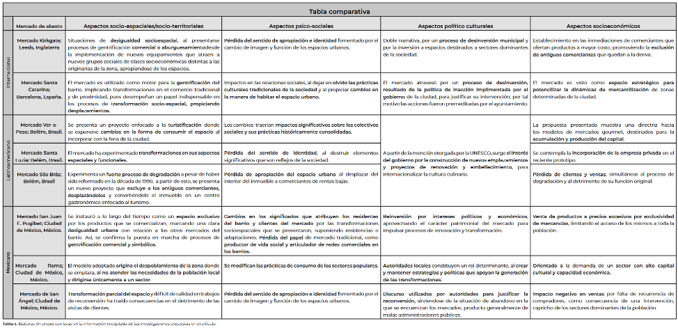 El objetivo principal de este trabajo es demostrar los procesos que aquejan a los mercados tradicionales en múltiples contextos del espacio global e identificar los aspectos en común que dejan evidencia de la implementación del conjunto de estrategias y soluciones utilizadas para modificar la estructura e imagen urbana, y que se convierten en modelos convenientes para la mercantilización de las ciudades como la única respuesta a las problemáticas urbanas, ocultando las desigualdades socioespaciales, la expansión de la pobreza, la exclusión y la violencia urbana que éstos generan.