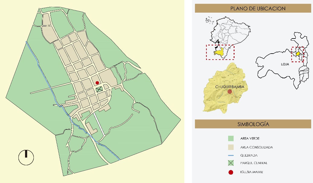 La parroquia de Chuquiribamba (Figura 1), está ubicada al sur del Ecuador en la provincia de Loja y al Noroeste del cantón del mismo nombre. Presenta un clima mesotérmico semi húmedo debido a encontrarse a 2725 m.s.n.m. El relieve rocoso representado por las cordilleras Santa Bárbara y Santo Domingo hacen del sitio un lugar de contrastes. Por un lado, el área de consolidada en donde se mantiene intacta su Arquitectura vernácula en tierra, con poca o ninguna alteración formal o constructiva. Y por otro lado, el paisaje natural que lo rodea, en donde la acción del hombre es casi imperceptible.