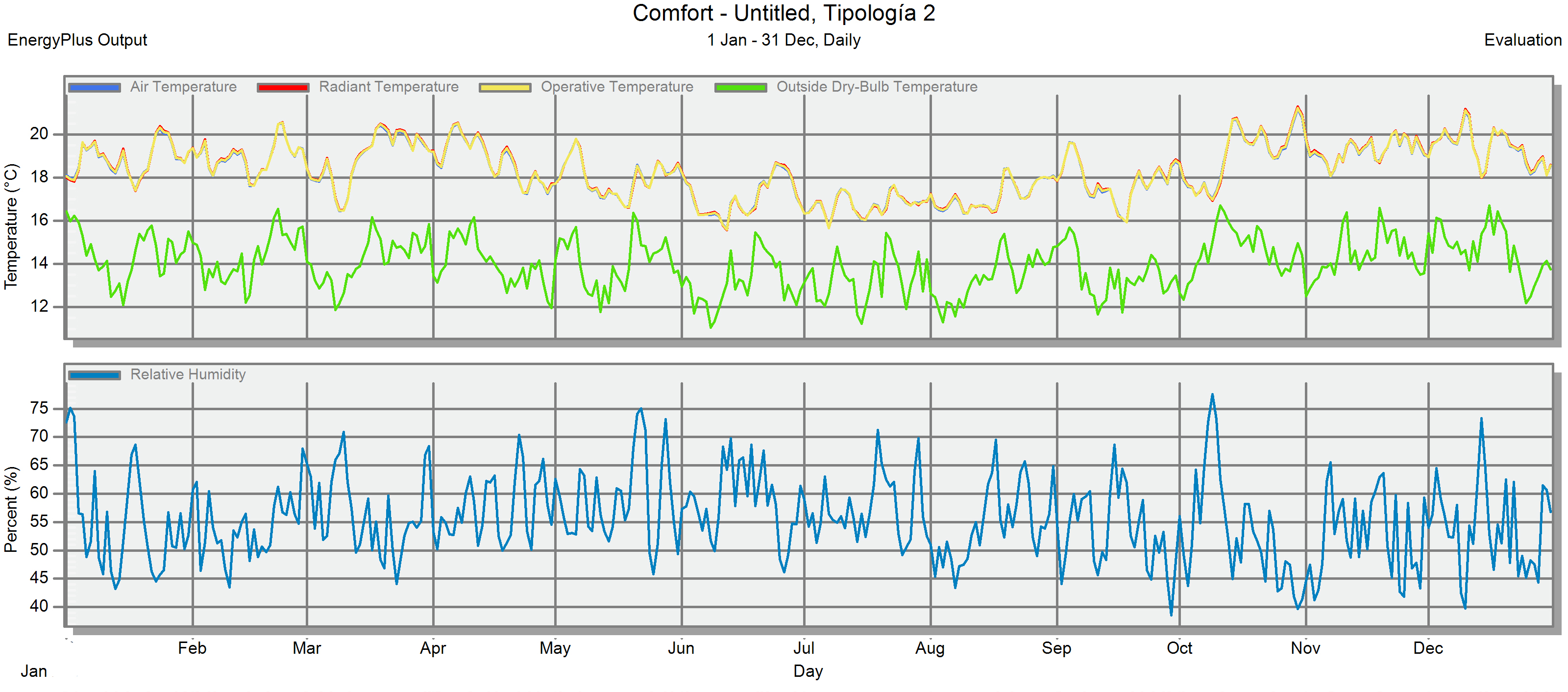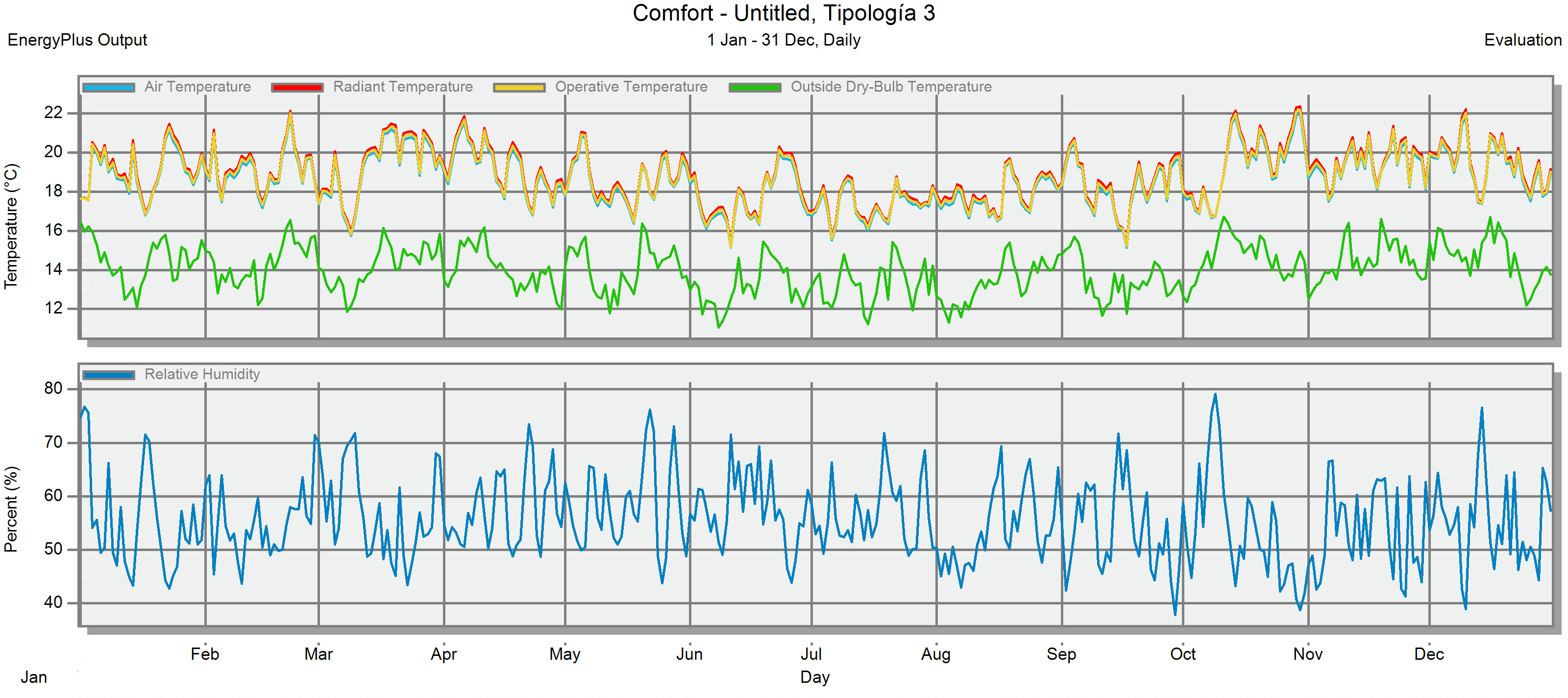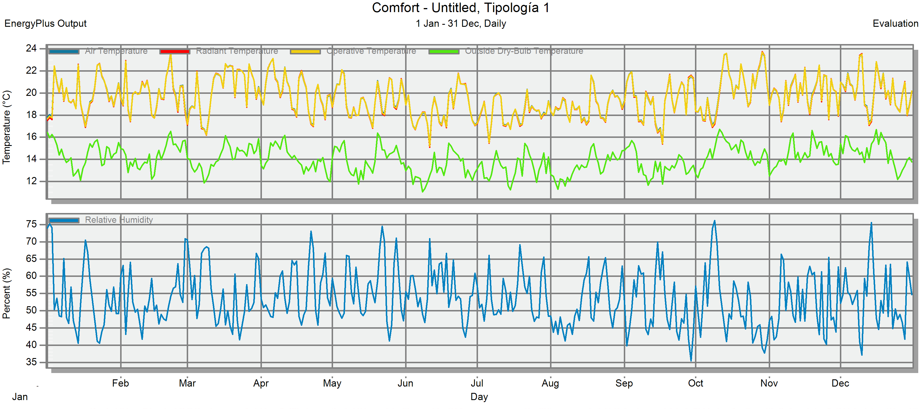 Figura 6. Temperatura del aire, radiante y humedad relativa interna diaria en todo el año en las tipologías V1 y V2 con la aplicación de DesignBuilder. Fuente: Los autores