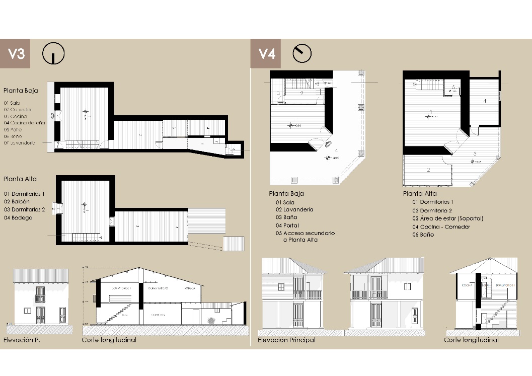 Figura 5. Tipología V3 (dos pisos sin portal), Tipología V4 (dos pisos con portal y soportal. Fuente: Los autores