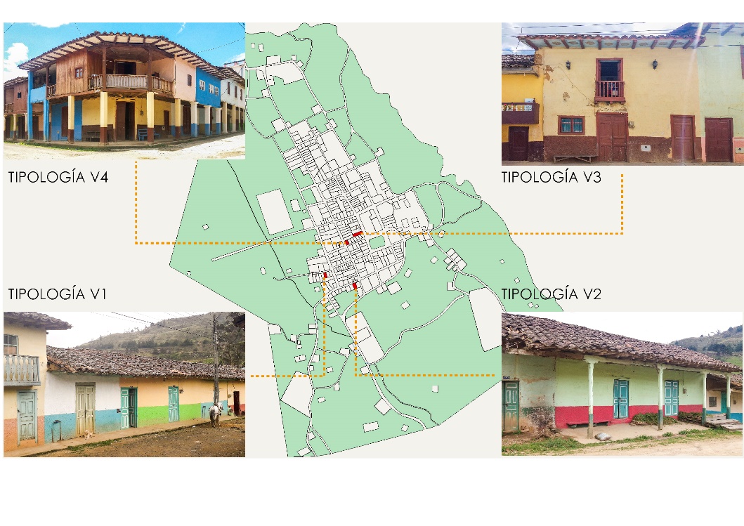 Figura 8. Tipología V1 (un piso sin portal, Tipología V2 (un piso con portal), Tipología V3 (dos pisos sin portal), Tipología V4 (dos pisos con portal y soportal). Fuente: Los autores