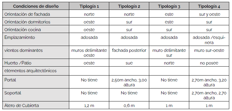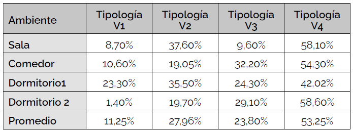De acuerdo al análisis de la evaluación térmica son las tipologías V1 y V3 las que presentaron mejores condiciones de confort térmico respecto a las tipologías V2 y V4, las cuales tienen diferentes orientaciones que dieron menores condiciones de confort (Tabla 3)