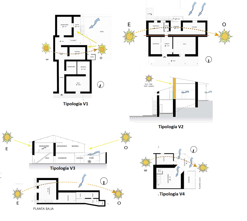 Figura 7. Incidencia de viento y sol en las cuatro tipologías. Fuente: Los autores
