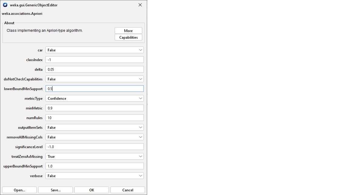 Actualmente, existen softwares que permiten calcular las reglas de asociación que cumplan con los parámetros de soporte y confianza que se les especifique. El algoritmo Apriori es uno, de entre otros (ej.: FP-Growth, Eclat), que se utiliza para calcular reglas de asociación. Antes de proceder a aplicarlo para calcular las reglas es necesario especificar algunos parámetros (figura 4).