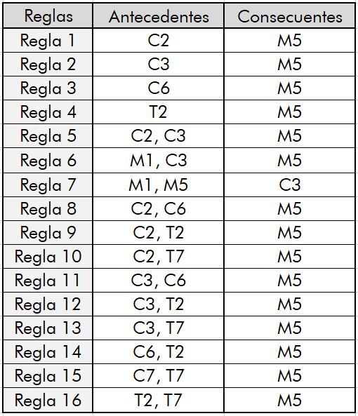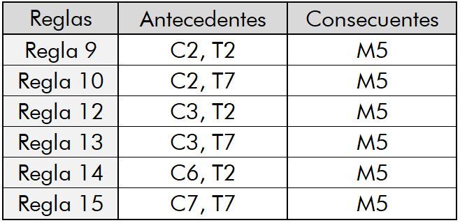 En la regla anterior se dice que C2 es el antecedente de la regla y M5 el consecuente. Un resultado así estaría afirmando que los elementos del par (C2, M5) aparecen (juntos) frecuentemente. Las reglas obtenidas (resultados) al aplicar el método de reglas de asociación al conjunto de establecimientos del sector salud se presentan y analizan en la sección siguiente.