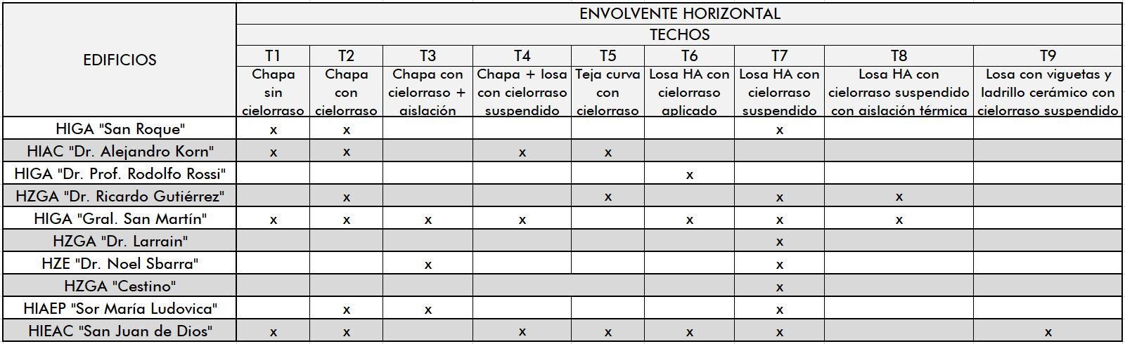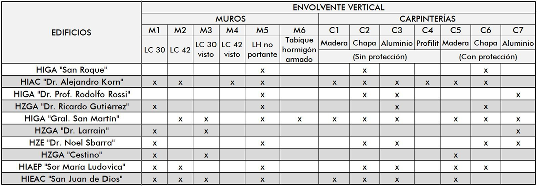 La edilicia construida representa más de un tercio del consumo de energía final a nivel mundial y casi el 40% del total de las emisiones de CO2. A nivel nacional, desde el punto de vista del consumo final de energía, en el año 2022 se observó que más del 34% correspondía al parque edilicio construido de los Sectores Residencial y Comercial-Público. En este contexto, los edificios hospitalarios, pertenecientes al Sector Comercial-Público, suelen figurar entre los menos eficientes desde el punto de vista energético, ya que presentan singularidades, como la ocupación continua, el equipamiento energo-intensivo y las rigurosas normas de habitabilidad, al mismo tiempo que brindan un servicio social (Discoli et al., 2021). Algunos autores señalan a los hospitales como los máximos consumidores de energía por unidad de superficie en el sector de los edificios (Bawaneh et al. 2019; Celis et al. 2019). Los establecimientos destinados a la salud requieren suministro energético de forma permanente durante las veinticuatro horas de todos los días del año, por lo que la energía representa un importante costo de funcionamiento. Los hospitales poseen elevadas demandas de energía para climatización, las cuales están directamente vinculadas a la Eficiencia Energética (EE) de la envolvente edilicia, ya que los materiales que la componen son los encargados de realizar el intercambio de calor entre el espacio interior y el entorno (Urteneche et al. 2022). Por consiguiente, es necesario formular estrategias de mejoramiento del nivel de aislamiento térmico en la envolvente edilicia, mejorar la eficiencia en equipos y luminarias, y aplicar sistemas para la transformación de energía solar en térmica y en eléctrica (Fondoso Ossola et al. 2022). En función de lo expuesto, este trabajo plantea desarrollar y aplicar una metodología que permita intervenir sobre la envolvente edilicia, a los efectos de mejorar su EE. Para ello, resulta conveniente identificar las soluciones tecnológico-constructivas más frecuentes y/o representativas de la envolvente vertical y horizontal, a los efectos de poder elaborar propuestas de reciclado edilicio aplicables a escala masiva.
