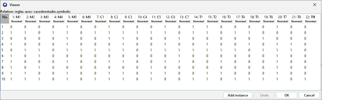E1= (a1,..,an, p1,…,pk, t1,...tr) es un vector donde a1,..,an son números que representan la/s alternativa/s posible/s en las carpinterías; p1,…,pk son números que representan la/s alternativa/s posible/s en muros y t1,...tr las correspondientes a los techos, respectivamente. Las variables ai, pi y ti son de tipo binario en donde un valor igual a uno significa que el elemento está presente en la envolvente y cero si no lo está. Esto es requerido para poder utilizar software que permitan obtener las reglas de asociación como Wekai o RapidMinerii ya que permiten importar archivos desde hojas de cálculo (ej.: en formato csv) donde los atributos se escriben en columnas. En este trabajo se utilizó el programa Weka, desarrollado en la Universidad de Waikato, por tratarse de un software libre distribuido bajo licencia GNU-GPL. En la figura 3 se puede observar cómo se ha importado un archivo csv y reconocido correctamente usando el software Weka. Se entiende por transacción a una fila cualquiera de la figura 3, donde se indica la presencia o ausencia de cada materialidad en la envolvente del edificio.