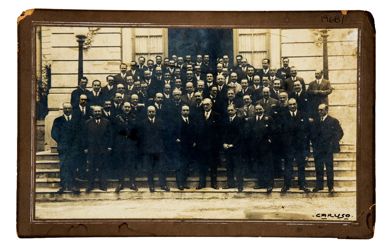 La imagen es, hasta cierto punto, un retrato de las relaciones de poder al interior de la profesión, con una generación de arquitectos egresados en la primera década del siglo XX -entre ellos, el propio Acosta y Lara, que obtuvo el título en 1903- que ocupaba aún los principales puestos de prestigio académicos,ii gremialesiii y que, durante la década de 1930 iba a acceder también a importantes cargos políticos en el ámbito gubernamental.iv La ocasión fue el homenaje realizado a Acosta y Lara luego de su participación como presidente del jurado en la primera fase del concurso internacional del Faro de Colón. La fotografía señala un momento cúlmine en la carrera de Acosta y Lara al mismo tiempo que connota la optimista proyección de la profesión apuntalada por el prestigio de las primeras generaciones.
