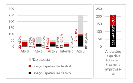 A partir do que mostra o gráfico 4, materializa-se que a espacialidade que Pirandello propõe em sua obra emprega sim uma espetacularidade teatral, ou seja, extra-cênica. Portanto, o paratexto de Esta noite improvisa-se envolve um uso de espaços arquitetônicos espetaculares teatrais. Especificamente, após a aplicação da metodologia, conclui-se que 35,4% das didascálias, em relação ao total de anotações textuais com características espaciais, referem-se a espaços espetaculares teatrais. Da mesma forma, o restante das anotações, 64,6% do total de anotações textuais com características espaciais, propõem representações do espaço espetacular cênico. Principalmente este uso espacial característico é relevante no Ato 0 da obra do autor italiano em que 80% das didascálias com características espaciais envolvem o uso de espaços espetaculares fora do cenário. O uso da espetacularidade teatral também é considerado relevante no Ato 2 (50% com relação ao total de anotações textuais com características espaciais) e nos Intervalos ficcionais da obra (68,2% com relação ao total de anotações textuais com características espaciais). Portanto, a utilização da tipología arquitetônica e a qualificação dos espaços utilizados seria a seguinte em ambos os casos: