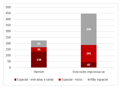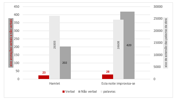 De acordo com o exposto no gráfico 1, infere-se que as anotações de cena na obra de Pirandello são mais de 50% mais utilizadas do que na de Shakespeare. No entanto, as anotações gerais feitas verbalmente são semelhantes em ambos os dramas. Em termos absolutos, estes resultados são acentuados e reafirmados a partir da sua comparação com a extensão em palavras de cada obra, também indicada no gráfico anterior. Ambas as extensões gerais, a de Hamlet (26.303 palavras) e a de Pirandello (24.608 palavras) são geralmente bastante semelhantes. Portanto, a diferença entre o uso das anotações é, na comparação da duração das obras, muito maior na obra do dramaturgo italiano.