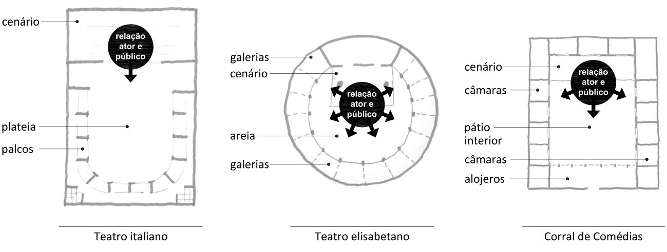 Por fim, é fundamental para este trabalho lembrar que a tipologia do teatro italiano, da qual nasceu a cenografia moderna (D'Amico, 1954), é a mais difundida e contemporânea (Macgowan & Melnitz, 1997). No entanto, existem outras tipologias arquitetónicas teatrais tradicionais ou convencionais. Embora seja verdade que estas outras tipologias, como as do teatro elisabetano inglês ou as dos Corrales de Comedias espanhóis, ainda estão ativas hoje (Coso Marín, Higuera Sánchez-Pardo, & Sanz Ballesteros, 1989), a tipologia italiana engolfou maioria dos espaços de drama (Surgers, 2004). Contudo, importa salientar que as suas diferenças tipológicas arquitetónicas no que diz respeito à forma e à função geram variações nas relações do espectador com a representação e, portanto, variam a recepção dos sinais. De forma esquemática, a imagem seguinte mostra as tipologias mencionadas, os seus espaços mais característicos e a ligação entre o ator e o espectador: