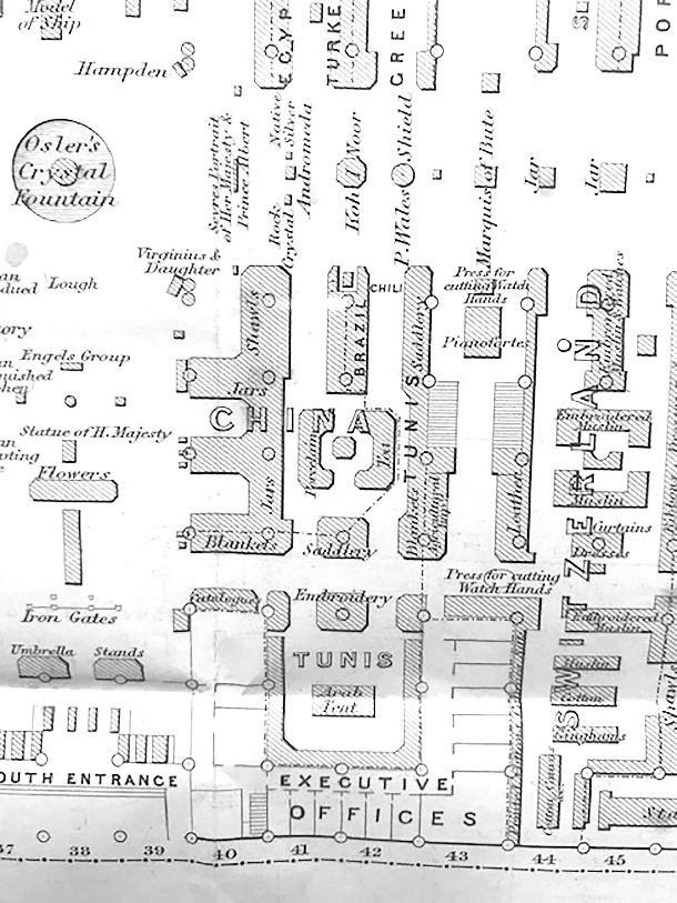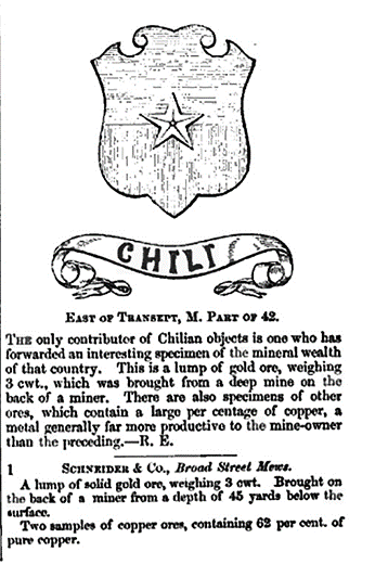 Tras una vitrina alargada de no más de 0,90 m de altura, sobre un exhibidor rojo, Chile en ausencia de una sección propia crea un “efecto de mundo real” ante los asistentes, con una muestra que contenía el imaginario del territorio nacional, a través de objetos concretos que representaban el comercio minero y una imagen tangible de Chile que recordar. Su presentación recordaba el relieve nacional, tal como lo comentaba la Guide of the Great Exhibition: “la apariencia de esta masa nativa de plata, es peculiar e interesante, consistente en varias capas, aparentemente unidas, pero apoyadas por simple contacto” (Routledges;1951, 173).