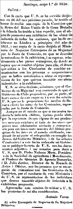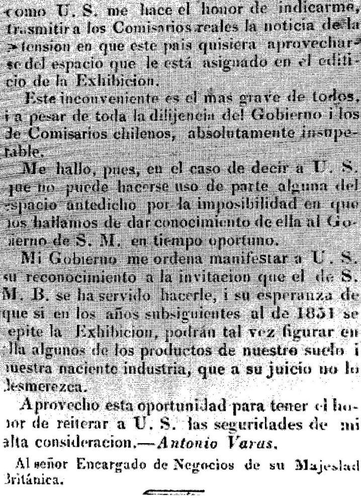 Aunque no fue una exhibición premiada, Chile recibió una mención ordinaria por su participación. Un primer y gran logro, para un territorio que durante los meses de la Exhibición de Londres enfrentaba conflictos políticos debido a la elección presidencial acaecida en septiembre de 1851.