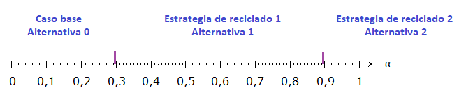 Para α=0,5 la alternativa 0 (situación base) es igual a la alternativa 2.