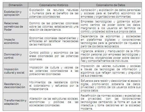 Comparar el colonialismo histórico y el colonialismo de datos se establece a través de un enfoque que permite comparar las dimensiones fundamentales con relación a sus estructuras y dinámicas. Las características identificadas para establecer este marco comparativo se basan en la explotación y apropiación de recursos, las relaciones asimétricas de poder, los impactos económicos, la dominación y control, las imposiciones culturales y sociales, la resistencia y descolonización, así como la transformación y adaptación (Couldry & Mejias, 2019).
