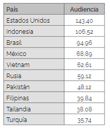 Tabla 12. Diez primeros países con mayores audiencias en millones para la red social TikTok a 2023