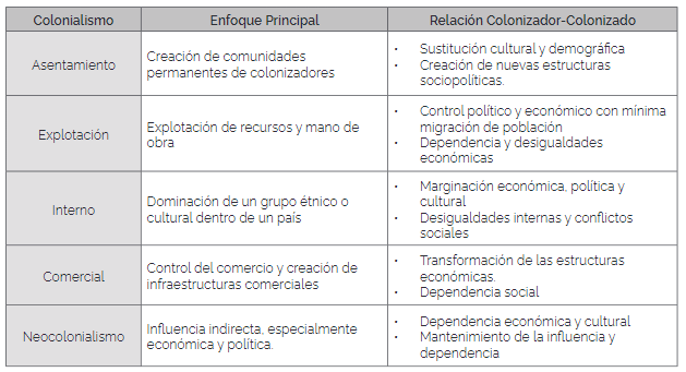 La revisión de la literatura con relación al colonialismo histórico identifico una mezcla de explotación sobre diversos tipos de recursos, dependencias económicas, políticas, la explotación de la mano de obra nativa y la imposición de estructuras culturales que han dado origen a las diversas formas de colonialismo en diferentes épocas y lugares (Bhuiyan, 2021; Sommer, 2011), representado y sintetizado a continuación: