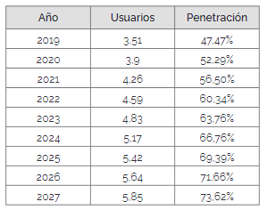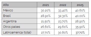 Tabla 14. Penetración de TikTok por país en Latinoamérica para los años 2021, 2022 y 2025