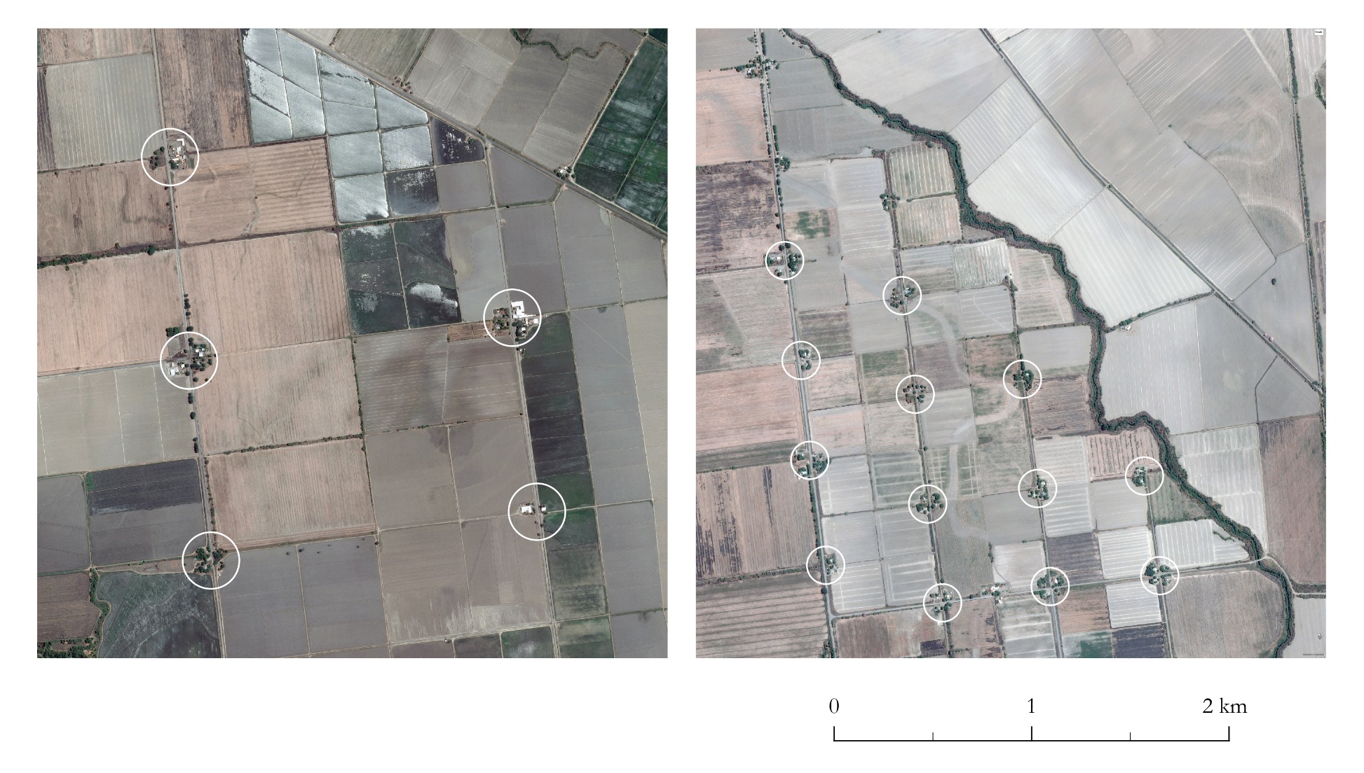 The irrigation works being carried out by the MOP in El Cenizo were already quite advanced when the Pérez Jiménez dictatorship took over. The development of the project continued under his government, albeit with significant modifications to the criteria of the original scheme. Primarily, the progressive comunidad agraria that was to benefit a large number of local peasants was now transformed into a conservative colony for twenty-seven agricultural experts—forty percent of which were foreign settlers—and the small plots intended for peasants were consolidated into large estates of one hundred hectares each to facilitate mechanized farming. [Fig.2] In this new context, a dispersed settlement pattern was preferred, in contrast to ITIC’s earlier attempts to separate agricultural plots from housing and concentrate families in village-like settlements. Because of a recent experience with a concentrated settlement, which had caused disputes among settlers due to the proximity between plots (Eidt, 1975), houses were now built on each parcel, in clusters of four, at the cadastral boundary crossings. Each cluster would share a warehouse for machinery, and the collective services would be concentrated in the central settlement (MAC, 1959).