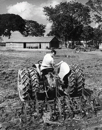 While twenty-seven families had been established in El Cenizo, more than seven hundred settlers moved to the colony of Turén in less than ten years (MAC, 1959). The ratio of foreign white colonists to Venezuelan peasants would resemble that of El Cenizo, albeit on a much larger scale than previous projects and with a discriminatory disparity in plot size that privileged European settlers—mostly Italians, but also Spaniards and Germans. [Fig.3] IAN defined two types of parcels: macro-parcelas, ranging from thirty to fifty hectares and regularly shaped to facilitate mechanized agriculture; and micro-parcelas of five hectares each for conucos, a Venezuelan term for small plots of cultivated land, generally used for subsistence farming. Nearly three hundred of the 728 settlers were foreigners, and almost all of them were given macro-parcelas. In addition, although some two hundred Venezuelans were also given similarly sized plots, almost all the micro-parcelas were given to local peasants (Hill & Beltrán, 1952; MAC, 1959). As stated in the 1957 MAC report, the rationale for this policy was to establish larger estates as models of a modern farm: “schools” where white European settlers would educate the local peasants holding micro-parcelas by example. Only when they acquired the modern techniques enabling efficient cultivation could they have a macro-parcela of their own (MAC, 1959). [Fig.4] This conception of the local peasant as a passive pupil without valuable knowledge of local conditions echoed that of the ITIC in the Danish colony of Chirgua.