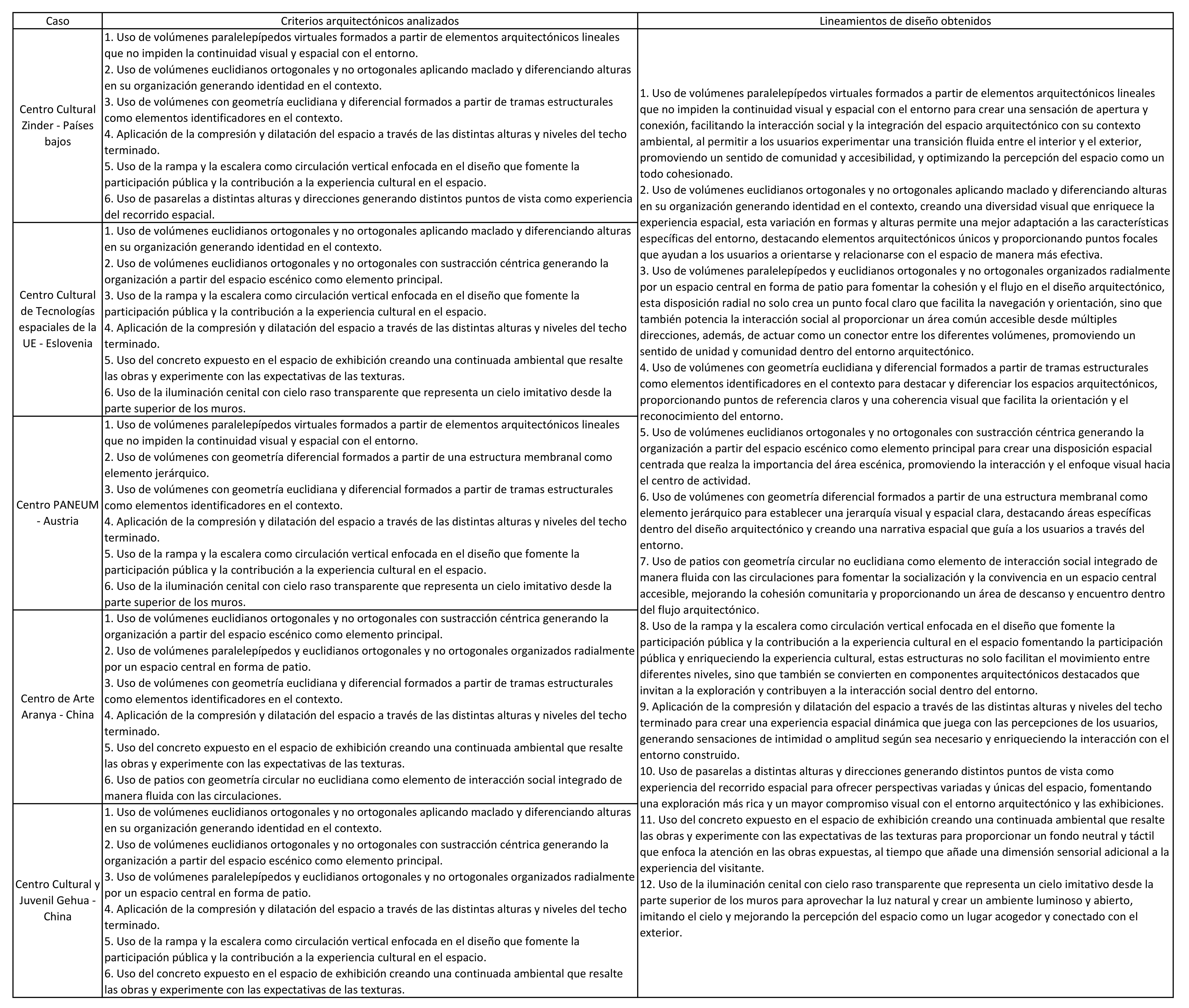 En cuanto a la Tabla 03, que resume la obtención de 12 lineamientos arquitectónicos, se logra identificar una gran influencia de la teoría en diversos aspectos, como la composición volumétrica, los elementos configurativos, la espacialidad y la materialidad: primero, en cuanto a la composición volumétrica se reconoce el uso de geometría euclidiana en mayor medida y geometría diferencial en menor (Vasquez, 2023), además se contempla una organización clara y en su mayoría radial a partir de un elemento principal, siendo el centro en todos los casos analizados, así mismo se pone en uso el recurso de interceptar los volúmenes a distintas alturas (Amayo, 2023) y el uso de sustracciones céntricas volumétricas (Buldaç, 2021), teniendo una gran repercusión, estos aspectos permiten mejorar la transición del exterior al interior de un proyecto, dando percepciones visuales atractivas al usuario y logrando que este construya un sentido de identidad y pertenencia de los espacios culturales en el contexto; segundo, en lo que respecta en elementos configurativos y espaciales, se observa el recurso de las diferencias de alturas de techo en las distintas zonas culturales, con un manejo claro de la compresión y dilatación del espacio (Lui, 2015) en todos los casos analizados, usando propuestas tales como las dobles alturas o inclinaciones de losas para lograr esta sensación espacial, también el uso de patios centrales que organizan al objeto arquitectónico (García, D), y el uso de la rampa, la pasarela y la escalera donde pasaron de ser elementos meramente de circulación a detalles esculturales que forman parte de la experiencia y exposición cultural (Rondon, 2024), aunque estuvieron presente en una menor medida de los casos, lograron repercutir en un gran nivel, permitiendo establecer relaciones espaciales fácilmente comprensibles para cualquier persona, enriqueciendo la interacción social, la participación pública y una experiencia cultural fluida y diversa dentro del espacio; tercero, en relación con la materialidad se identificaron 3 tipos, se plantea la utilización de elementos traslúcidos para crear volúmenes virtuales que permiten la continuidad visual y espacial con el entorno (García, D), con una mediana repercusión en los casos juega un papel importante para la conexión con el medio urbano y natural existente, donde el proyecto se entiende como una extensión del mismo lenguaje al contexto inmediato, mientras que el uso de elementos semitraslucidos, ya sea iluminación cenital que imita al cielo, o el uso del concreto expuesto con distintas texturas y aplicaciones (Lui, 2015), tiene una menor repercusión en los proyectos del ámbito cultural, ya que se encuentran enfocados mayormente en espacios o ambientes dedicados a exposición de arte pictórico y escultural.