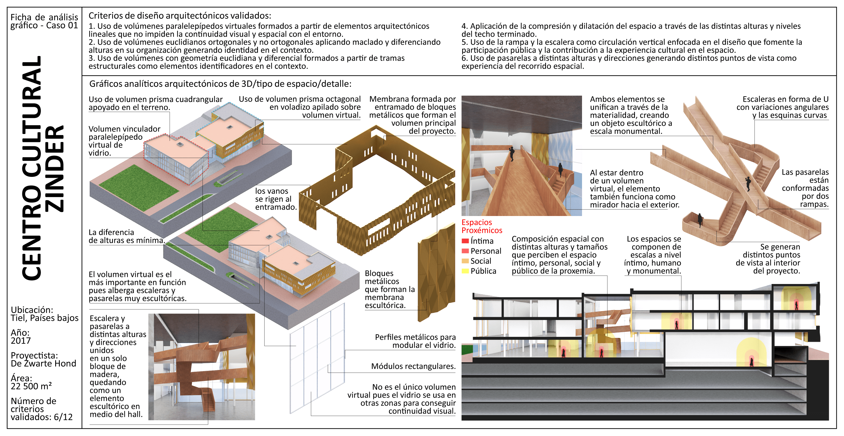 Para demostrar la relevancia de la aplicación de la teoría de la proxémica de Edward T. Hall en espacios culturales. Fue necesario hacer en primera instancia una revisión documental; tras obtener una lista de 12 criterios arquitectónicos con base en el análisis anterior, se pretende verificar la aplicación de ellos en distintos proyectos internacionales del ámbito cultural, para finalmente convertir estos criterios en lineamientos de diseño. A continuación, se mostrará el estudio de cada caso a través de un lenguaje descriptivo inicial y gráficos explicativos.