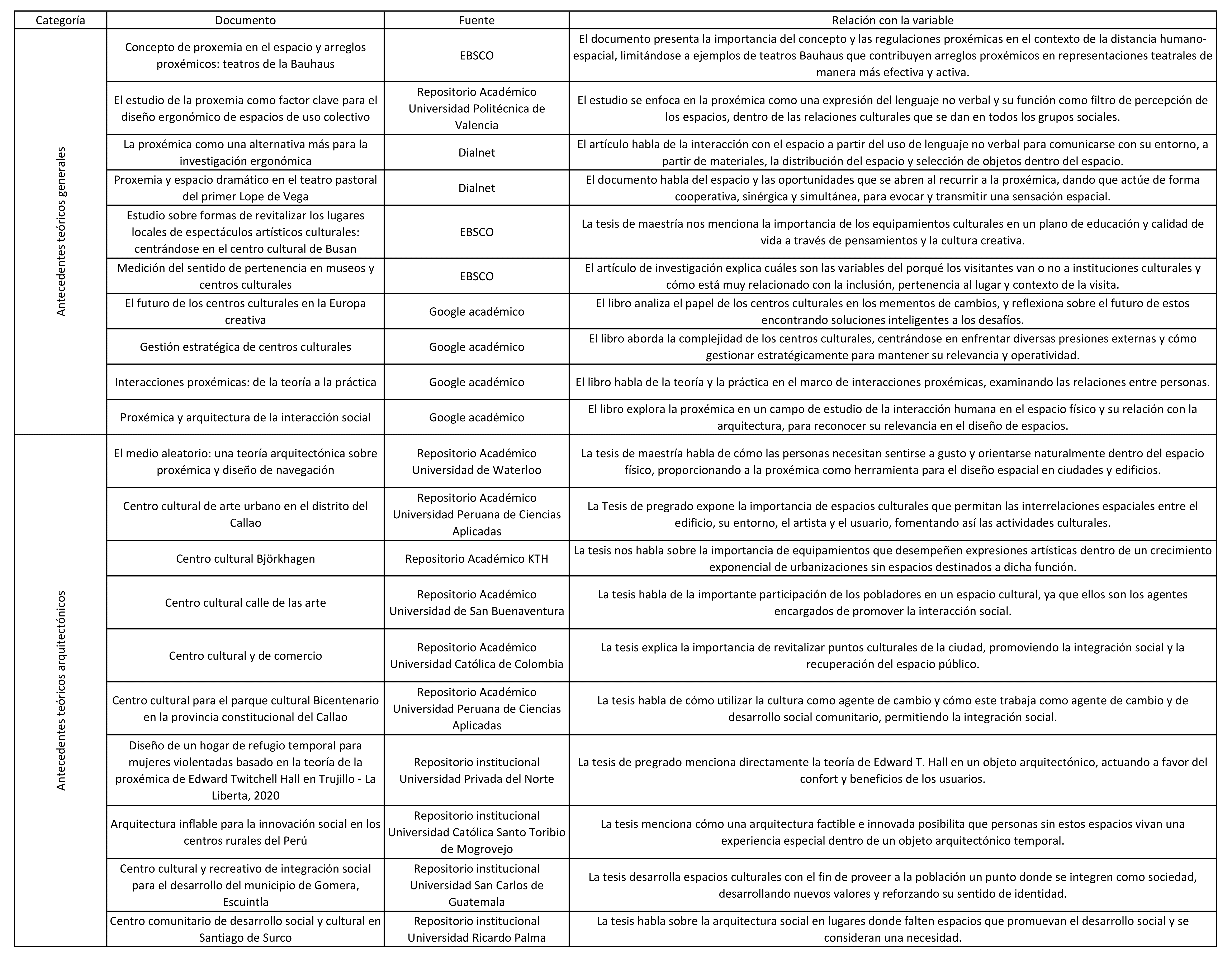 Se tuvo en cuenta la exploración de dos tipos de antecedentes: teóricos generales, que proporcionan información sobre la variable globalizada sin ser experimental, considerando libros, artículos de investigación, revistas indexadas y tesis de nivel de maestría y doctorado, esta exploración documental fue valiosa para poder aterrizar aquellos principios que definirían la teoría de la proxemia de Edward T. Hall, ya que se enfocó en el estudio del uso de la variable en objetos arquitectónicos y su impacto en las personas y en la arquitectura. Y teóricos arquitectónicos, centrándose en proyectos arquitectónicos donde la variable forma parte del diseño, se consultaron tesis de grado de arquitectura de universidades reconocidas en un panorama internacional. Esta perspectiva comparativa contribuyó a enriquecer el análisis científico al proporcionar una comprensión matizada de las complejidades involucradas en la integración de la variable en el diseño arquitectónico en diferentes contextos.