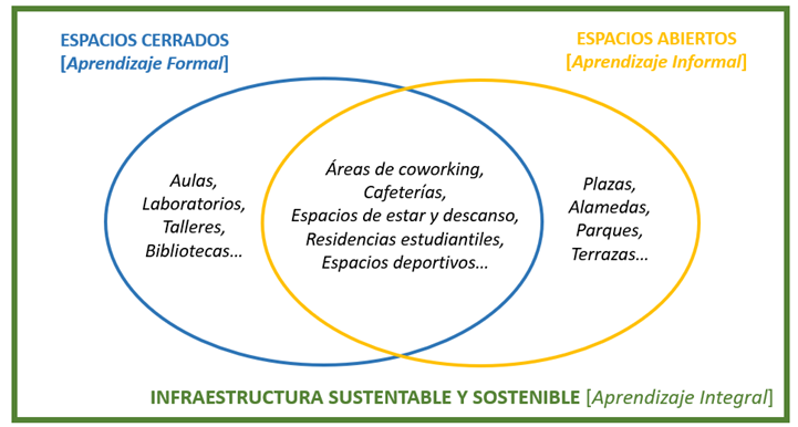 The evolution of university centers has been oriented towards the reconfiguration of their open spaces as a natural extension of the indoor training environments and at the same time serving not only as containers for the various social interactions of their occupants but also as beneficial settings for physical health. mental. The references shown are located in the city of Lima and reflect the valuation and leading configuration of open spaces through their positioning as main axes of design, supporting what is stated in the scientific literature. This article seeks to contribute to a change of perspective of the different types of university open spaces, perceived as external voids of a passive nature, neglected during the growth stage of the Latin American educational infrastructure of recent decades, and present them as dynamic components, elementary and facilitators of the student's informal activities capable of cooperating with formal teaching spaces in obtaining favorable environments for integral learning processes.