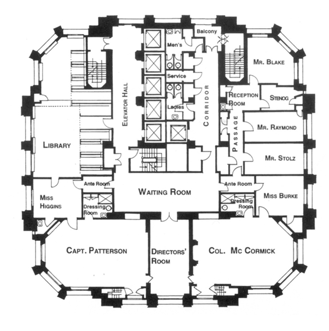Así, debemos entender la propuesta de los arquitectos alemanes en primer lugar como una síntesis de las ideas de planta libre planteadas por el Movimiento Moderno. Partiendo de la Fagus Fabrik y pasando evidentemente por los principios fundacionales de la Bauhaus, todos los planteamientos que Gropius propone en sus obras anteriores parecen sintetizarse en un esquema en altura con coherencia espacial y tecnológica que nos obliga a interpretar las plantas del Movimiento Moderno desde una crítica no sólo industrial y pictórica, sino también estrictamente ideológica. El espacio del Chicago Tribune de Gropius y Meyer, como lo era el de la Fagus Fabrik, representa no sólo una liberación del espacio a través de los cambios en los sistemas estructurales, sino una desaparición de lo que en plantas pretéritas habían supuesto espacios segregadores. Esa libertad estructural expresada con la desaparición, real y cultural, de los muros de carga perimetrales, sitúa al espacio del Chicago Tribune planteado por estos arquitectos europeos en un posicionamiento ideológico, esto es, en el empleo de las estrategias de planta libre como generadoras de un espacio más democrático y por lo tanto más capaz de pulir estructuras fuertemente jerarquizadas, fomentando con ello la apuesta por organizaciones más horizontales. De esta manera, si lo que en el proyecto de Gropius y Meyer quiere suponer un cambio espacial generador de conductas más libres y flexibles, en la planta de Hood y Howells el espacio queda, irremediablemente, delimitado por la compartimentación espacial existente; las actividades se limitan y las jerarquías se subrayan. La arquitectura expresa así su vocación de imponer y delimitar espacios exclusivos no conectados y estrictamente opacos en los que cada lugar corresponde a una actividad demasiado concreta y demasiado previsible, comprendiéndose una colaboración evidente entre la manera en la que la institución se entiende a sí misma, y la arquitectura que la representa.