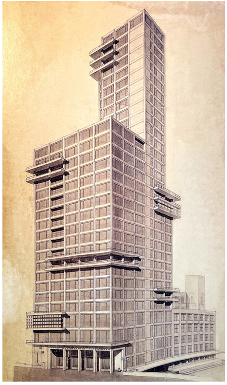 Así, situamos el análisis de este artículo dentro de este marco general que valoramos, sin embargo, puede ser explicado por medio de dos propuestas concretas, las cuales este ensayo considera que reflejan de manera más evidente este enfrentamiento no sólo arquitectónico, sino ideológico y político: El concurso ganador presentado por el estudio conformado por los arquitectos americanos Raymond Hood y John Mead Howells (Fig. 2), y el presentado por los arquitectos europeos Walter Gropius y Adolf Meyer (Fig. 3). Representantes por comparación de cómo la mirada europea en contraposición con la norteamericana no nacía de un antagonismo exclusivamente estilístico, sino también, y muy particularmente, de una manera diferente de ordenar los espacios de trabajo y las jerarquías sociales, este artículo centrará su atención en un entendimiento de la arquitectura de las dos propuestas desde un punto de vista estrictamente hermenéutico.