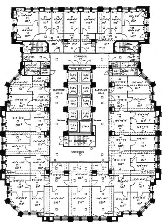 Nos encontramos, al fin, frente a lo que Tafuri denominaba “exaltación de la individualidad” (Tafuri, 1975). En este sentido, entendiendo el producto arquitectónico como esa segunda piel a la que hacía mención Argan (Argan, 2006), podemos entender la planta del proyecto de Hood y Howells como una suma de rutinas colectivas en las que la arquitectura dificulta el colectivismo y fomenta el protagonismo de individuos concretos (Argan,2006). Síntoma de este hecho no es solo la presencia de pasillos segregadores, sino el esfuerzo patente llevado a cabo por los arquitectos a la hora de diferenciar espacios a través del propio dibujo de las dos plantas analizadas, frente a la más que probable ausencia de obstáculos en la arquitectura de Gropius y Meyer. Así, mientras podemos suponer la casi ausencia de rotulación en las plantas del arquitecto de la Fagus Fabrik, la planta dibujada por los arquitectos norteamericanos para el Chicago Tribune incide y exagera la presencia de espacios “con nombre”. De esta manera, y a través de la rotulación de los espacios especificados se comprende la vocación cultural existente de dos conceptos fundamentales: la segregación espacial a través de la asignación de estancias para los altos directivos de la empresa, y la ausencia de flexibilidad en una planta cuya representación es toda una declaración ideológica de intenciones. Ayuda para entender este posicionamiento no sólo el juego comparativo llevado a cabo con la planta imaginada de Gropius y Meyer sino la comparación entre dos plantas del mismo proyecto. Tal y como se muestra, mientras en la planta de altos directivos (Fig. 4) se individualizan y se nominalizan las plantas para cada individuo, las plantas comunales de trabajadores del periódico (Fig 5) son anónimas, incidiendo sin embargo en una compartimentación evidentemente cultural y que llega a generar espacios mal iluminados (6). La arquitectura por tanto manifiesta su intención de no mezclar distintos tipos de personas y estamentos laborales, estableciendo con ello un posicionamiento no sólo arquitectónico, sino evidentemente político. Así, y entendiendo la crítica desde una perspectiva histórica, parece evidente pensar que la planta del proyecto ganador fue concebida no solo bajo criterios estilísticos, sino con la clara voluntad de conservar costumbres y conductas fuertemente impregnadas en la sociedad americana de finales del siglo XIX y principios del XX (7). Evidenciar el profundo cambio cultural que hubiera supuesto el espacio planteado por Gropius y Meyer, es evidenciar las profundas diferencias entre dos culturas que se encontraron en un mismo momento y en un mismo lugar (8).
